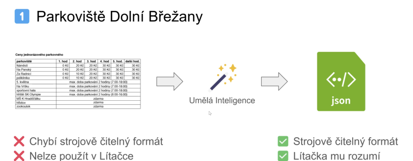 Projekt Parkování s Lítačkou pomocí AI zpřístupní klíčové informace o parkovištích, jako je provozní doba, cena či kapacita, přímo v aplikaci Lítačka. Mnohé obce v okolí Prahy nemají tato data ve strojově čitelném formátu. Náš projekt je proto pomocí AI dokáže získat například z textů na webových stránkách obcí. Výsledkem budou přesnější a snadno dostupné informace, které obyvatelům i návštěvníkům usnadní plánování parkování. Pro město to znamená plynulejší dopravu – řidiči nebudou zbytečně hledat volná místa, ale zamíří rovnou na konkrétní parkoviště, kde pohodlně zaparkují.